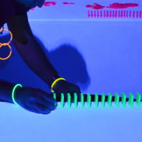 Die Schwarzlicht Weihnachtsfeier verbindet ein stilvolles Weihnachtsessen mit einem interaktiven Teamturnier im Dunkeln. In einem Raum, in dem ausschließlich weiße und fluoreszierende Elemente leuchten, treten Ihre Mitarbeitenden in Teams gegeneinander an.
