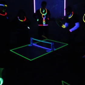 Tische, Netze, Schläger, Bälle und weiteres Zubehör werden so präpariert, dass sie unter UV-Licht leuchten – für beste Spielbarkeit und maximale Atmosphäre.