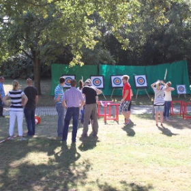 Bogenschießen ist eines unserer beliebtesten Outdoor Eventmodule und bereichert jede Mitarbeiterveranstaltung. Kombiniert mit einem abwechslungsreichen Hindernisparcours und riesigen Teamskiern wird es zu einem unvergesslichen Gruppenerlebnis, dass Ihre Mitarbeiter begeistern wird und neue Horizonte des Teamworks eröffnet.