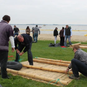 Beim Floßbau konstruieren die Teams ein tragfähiges Floß. Hier sind Kommunikation, Planung und Zusammenarbeit entscheidend – denn am Ende folgt der Praxistest auf dem Wasser.